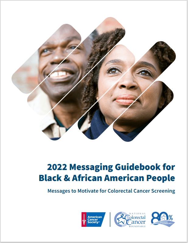 The ACS NCCRT 2022 Messaging Guidebook for Black & African American People: Messages to Motivate for Colorectal Cancer Screening is intended to provide clinicians and public health professionals with information and tools to help you work towards closing disparity gaps by using effective, tailored cancer screening messaging to help motivate people to get screened.