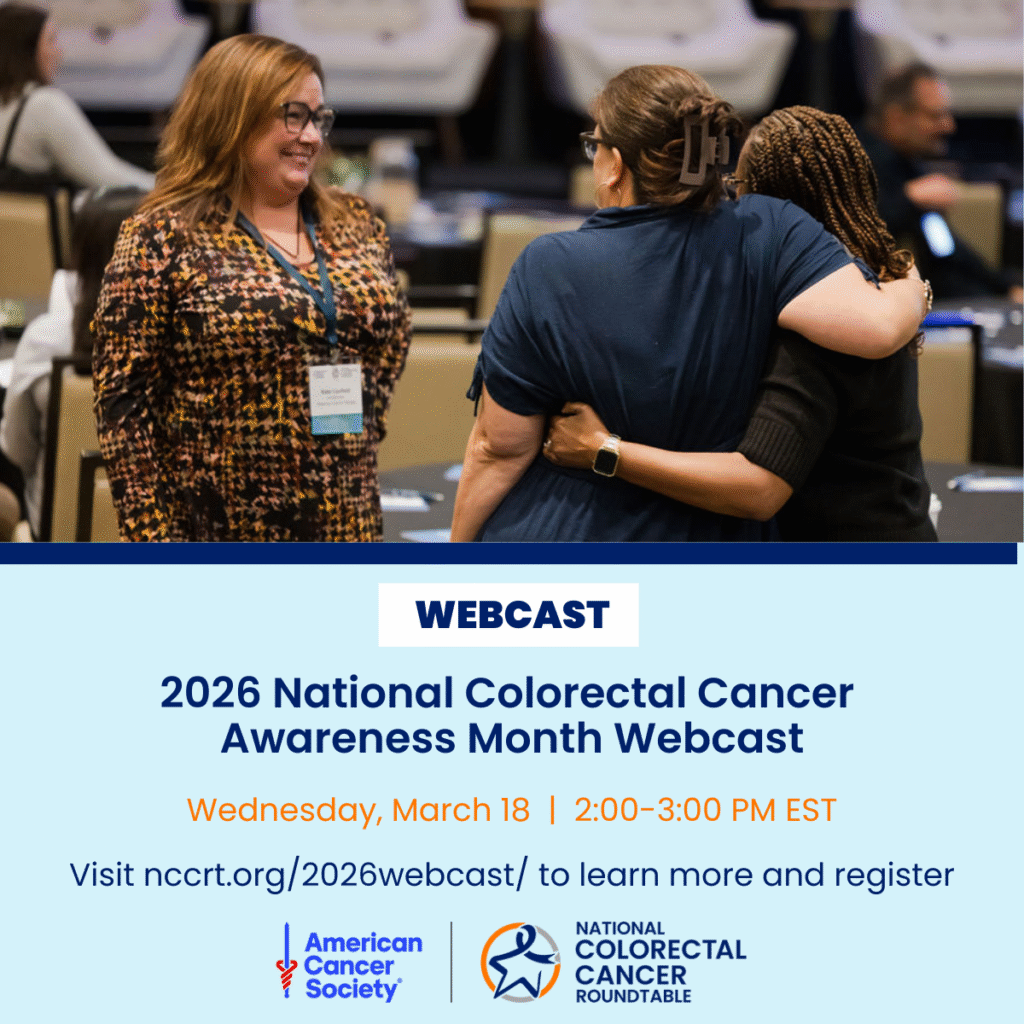 The 2026 National CRC Awareness Month webcast is just two weeks away! This virtual event, which takes place on Wednesday, March 18 from 2-3pm ET, will spotlight national achievements across the CRC community and provide the latest state‑of‑the‑field updates that guide our collective efforts to reduce CRC mortality and disparities. Plan to join us with this year’s theme: “Uniting for Equity Across the CRC Continuum,” with speakers Rebecca Seigel, Bill Thach, our 2026 Awardees, and our ACS NCCRT chairs.